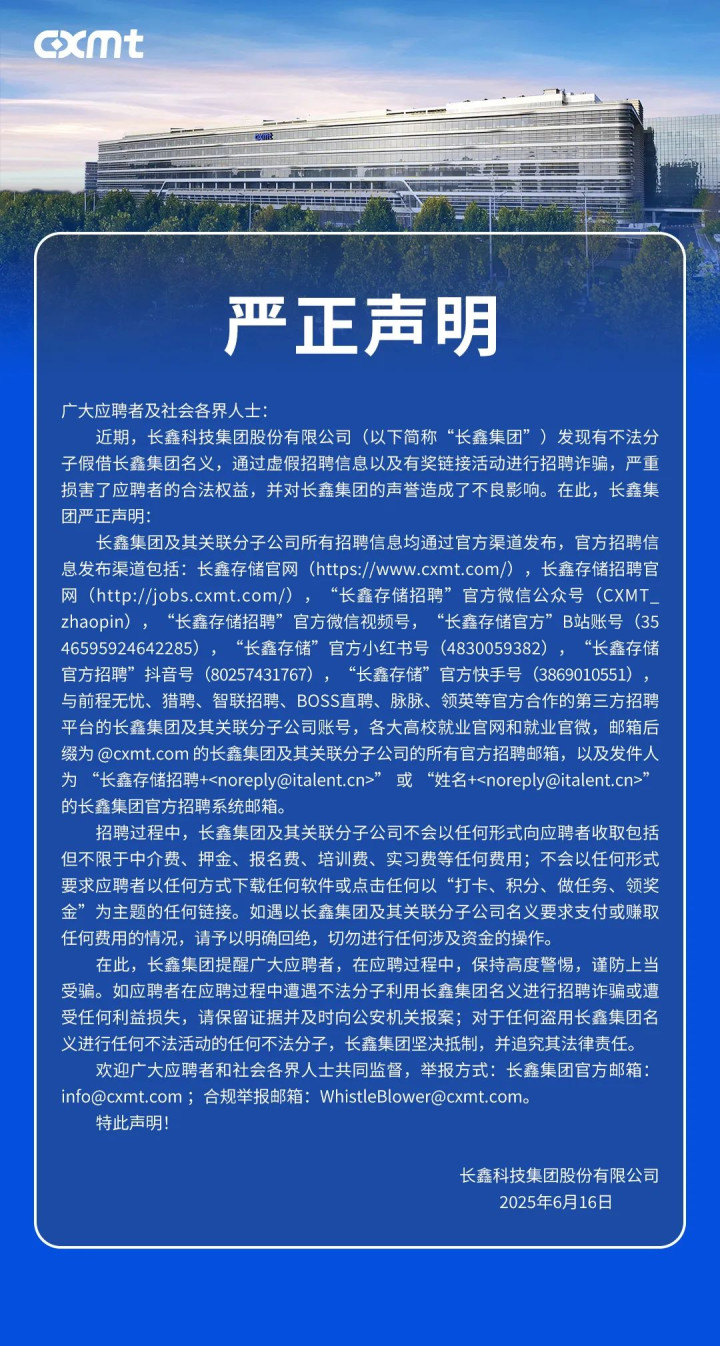 6月16日下午,国产DRAM芯片大厂长鑫存储母公司——长鑫科技集团股份有限公司(以下简称“长鑫集团”)发布声明称,近期,长鑫集团发现有不法分子假借长鑫集团名义,通过虚假招聘信息以及有奖链接活动进行招聘诈骗,严重损害了应聘者的合法权益,并对长鑫集团的声誉造成了不良影响。
