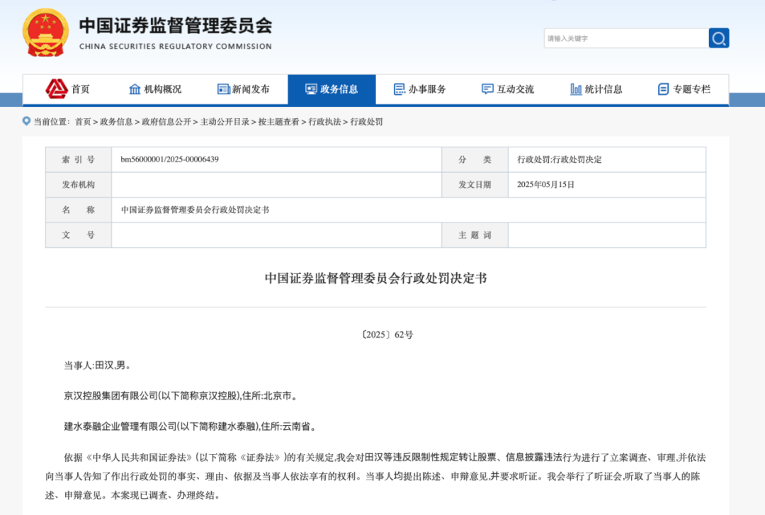 一、对田某、京汉控股、建水泰融违反限制性规定转让股票的违法行为,责令改正,给予警告,没收违法所得,并处以罚款。其中,没收田某违法所得1.93亿元,并处以2000万元罚款;对京汉控股处以600万元罚款;没收建水泰融违法所得298.31万元,并处以50万元罚款。
