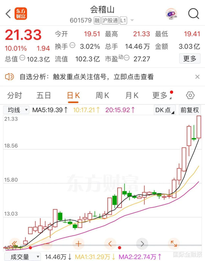 截至收盘,会稽山涨停,报收21.33元/股,总市值升至102.3亿元,一举超越古越龙山(97.26亿元),夺回“黄酒市值一哥”之位;古越龙山报收10.67元/股,上涨3.89%;金枫酒业报收6.27元/股,上涨4.67%,总市值41.95亿元。